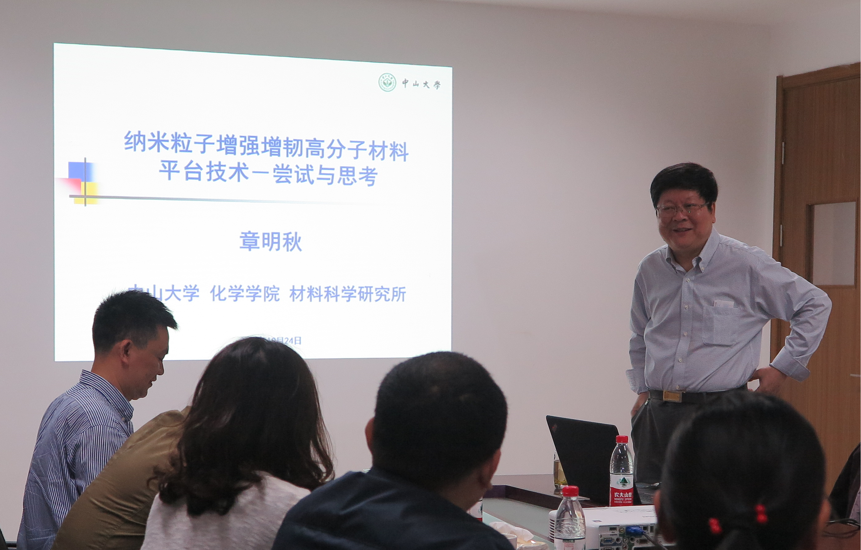 2018年10月25日上午10:00,中山大学章明秋教授应社团学姐 李勇进教授的热情邀请,为材化师生做了题为“纳米粒子增强增韧高分子材料的平台尝试——尝试与思考”的学术报告。