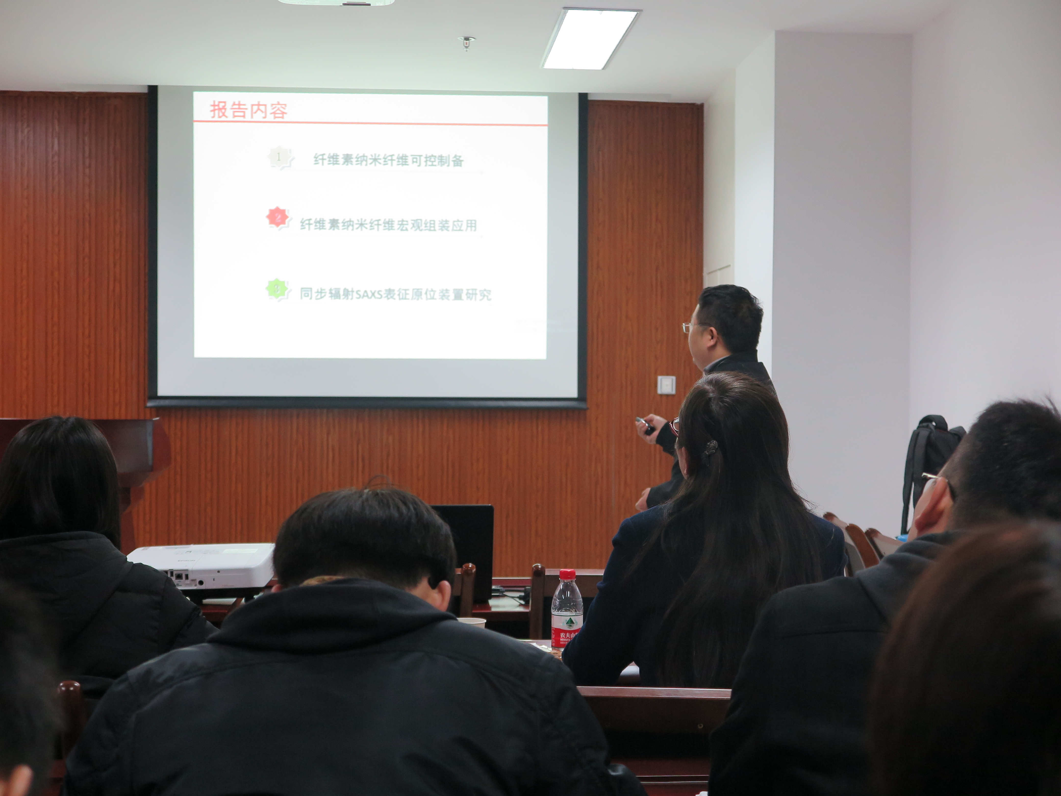 林金友,中国科学院上海高等研究院—上海同步辐射光源研究员,从事X射线散射技术在纤维聚合物结构表征中的应用以及聚合物微纳米纤维制备与应用等研究工作。本次报告中,林金友研究员为我们详细介绍了纤维素纳米纤维可控制备,纤维素纳米纤维宏观组装应用以及同步辐射SAXS表征原位装置研究。在座的师生认真听取了报告,并与林金友研究员展开了深入的交流讨论,令各位师生对纤维素纳米纤维与SAXS表征设备有了更加深入的了解与认识。