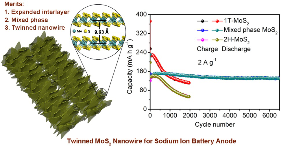 近日,我院叶伟博士、高鹏教授与山东大学熊胜林教授等团队合作在层状材料用于钠离子电池方面取得重要进展。该团队成功发展了有机小分子插层以及混相策略调控钠离子嵌入/脱出动力学以及电极材料的导电能力,用于钠离子电池负极材料表现出了超高的循环稳定性,该结果以“Metal-Semiconductor Phase Twinned Hierarchical MoS2 Nanowires with Expanded Interlayers for Sodium-Ion Batteries with Ultralong Cycle Life”为题发表在国际著名杂志Small (Small, 2019, 1906607,最新影响因子:10.8)。