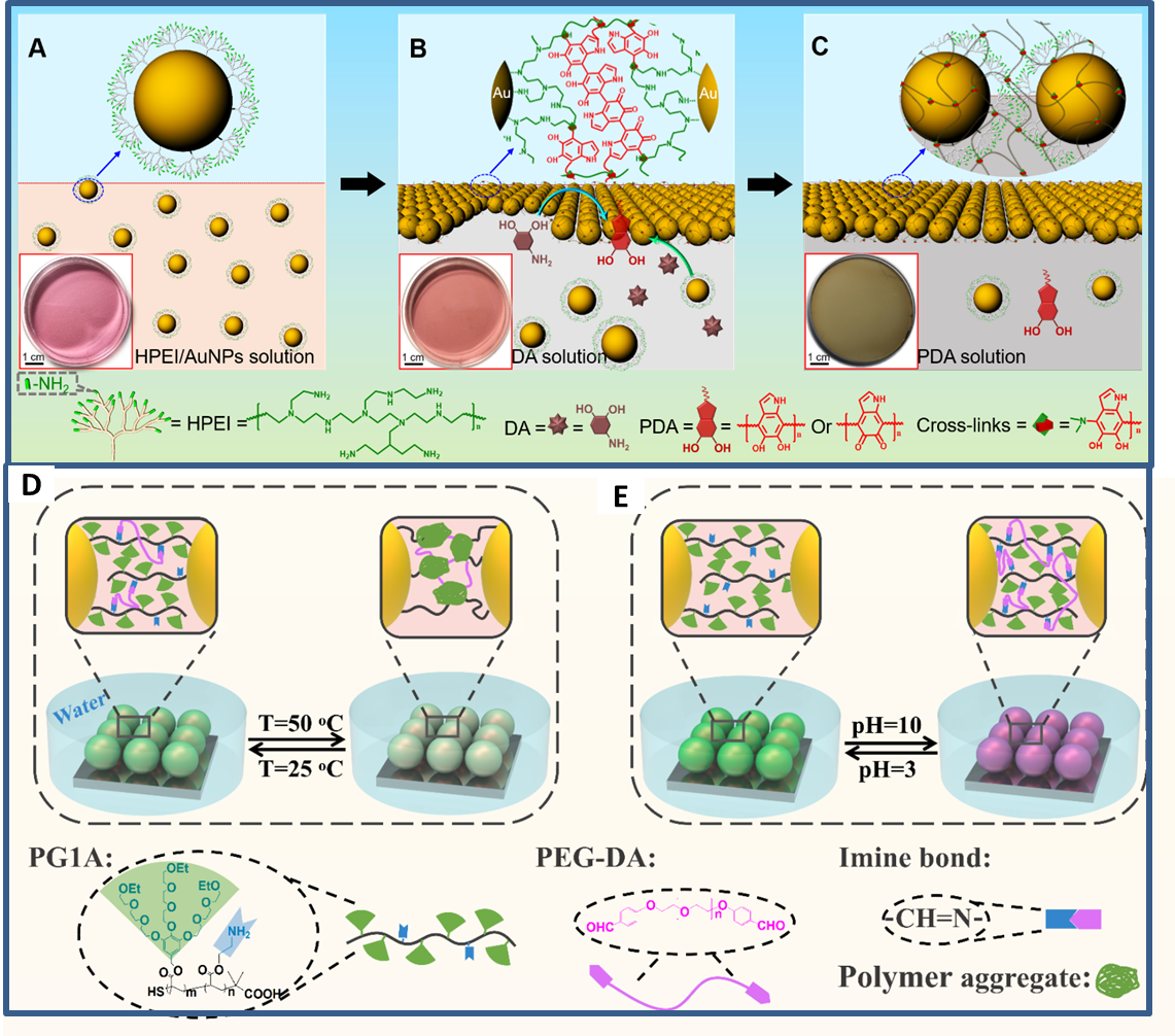 图2多巴胺自聚调控的纳米金粒子液液界面自组装(A-C);烷氧醚树枝化体系共聚物调控的纳米金粒子单层膜以及双刺激响应性(D和E)。