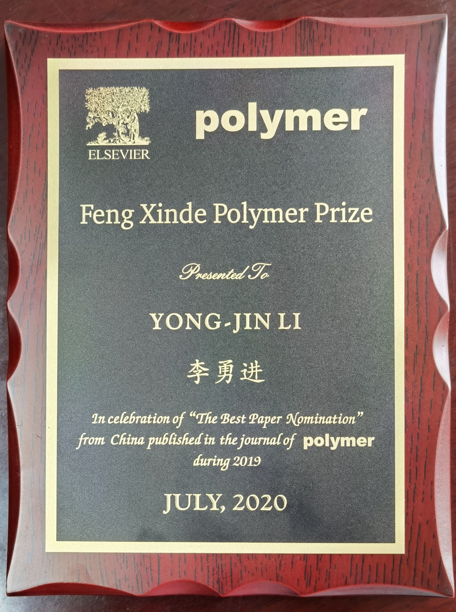 本次奖项由POLYMER期刊亚洲区资深编辑、主编及POLYMER期刊华裔编委组成评审委员会,经过公正严格的评阅,最终从全年300多篇论文中评出本年度“冯新德高分子奖”最佳文章奖1篇和最佳文章提名奖9篇。李勇进教授获得最佳文章提名奖。论文第一作者为本校2020年毕业硕士研究生杨鑫。值得一提的是,这是李勇进教授继2018年获得第十二届冯新德高分子奖以来第二次获此殊荣。