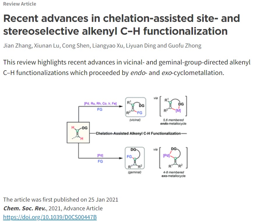 近日,社团学姐 社团学姐 的张坚教授与钟国富教授,凭借课题组近五年来在配位导向下烯烃惰性碳氢键的选择性活化/官能团化研究领域的出色工作,受邀总结了本课题组和国内外同行们在该领域中同碳位和邻碳位碳氢键官能团化反应,包括:烯基化、烯丙基化、烷基化、芳基化、卤化、以及多米诺环化等,并对各种方法的优缺点进行归纳和总结,最后对该领域的发展和应用进行展望。该成果近日以题为“Recent advances in chelation-assisted site- and stereoselective alkenyl C–H functionalization”,在英国皇家化学学会顶级综述期刊Chemical Society Reviews(IF: 42.846)上发表(Chem. Soc. Rev., 2021, DOI: org/10.1039/D0CS00447B, Advance Article)。张坚教授和钟国富教授为该文章的共同通讯作者。