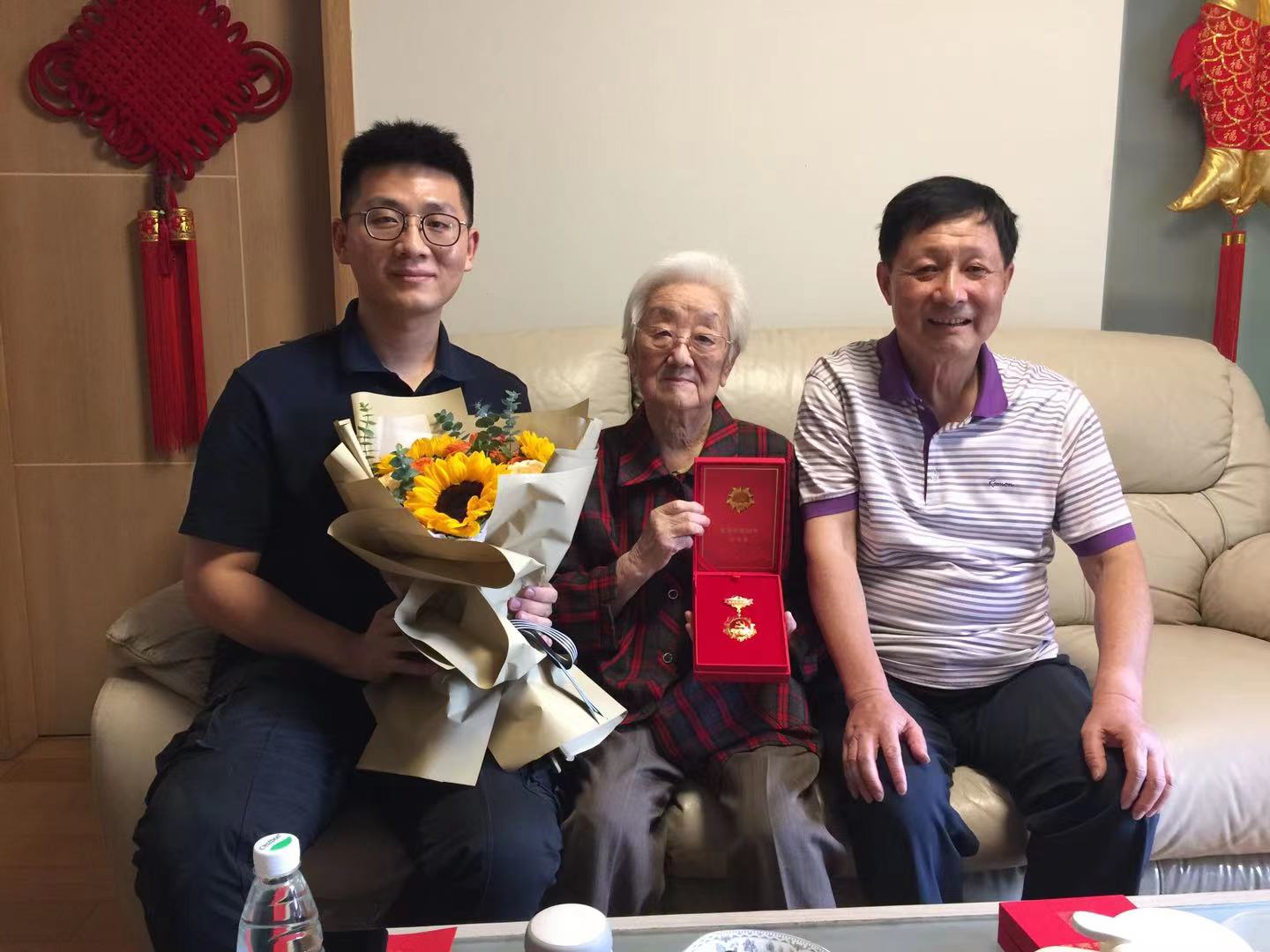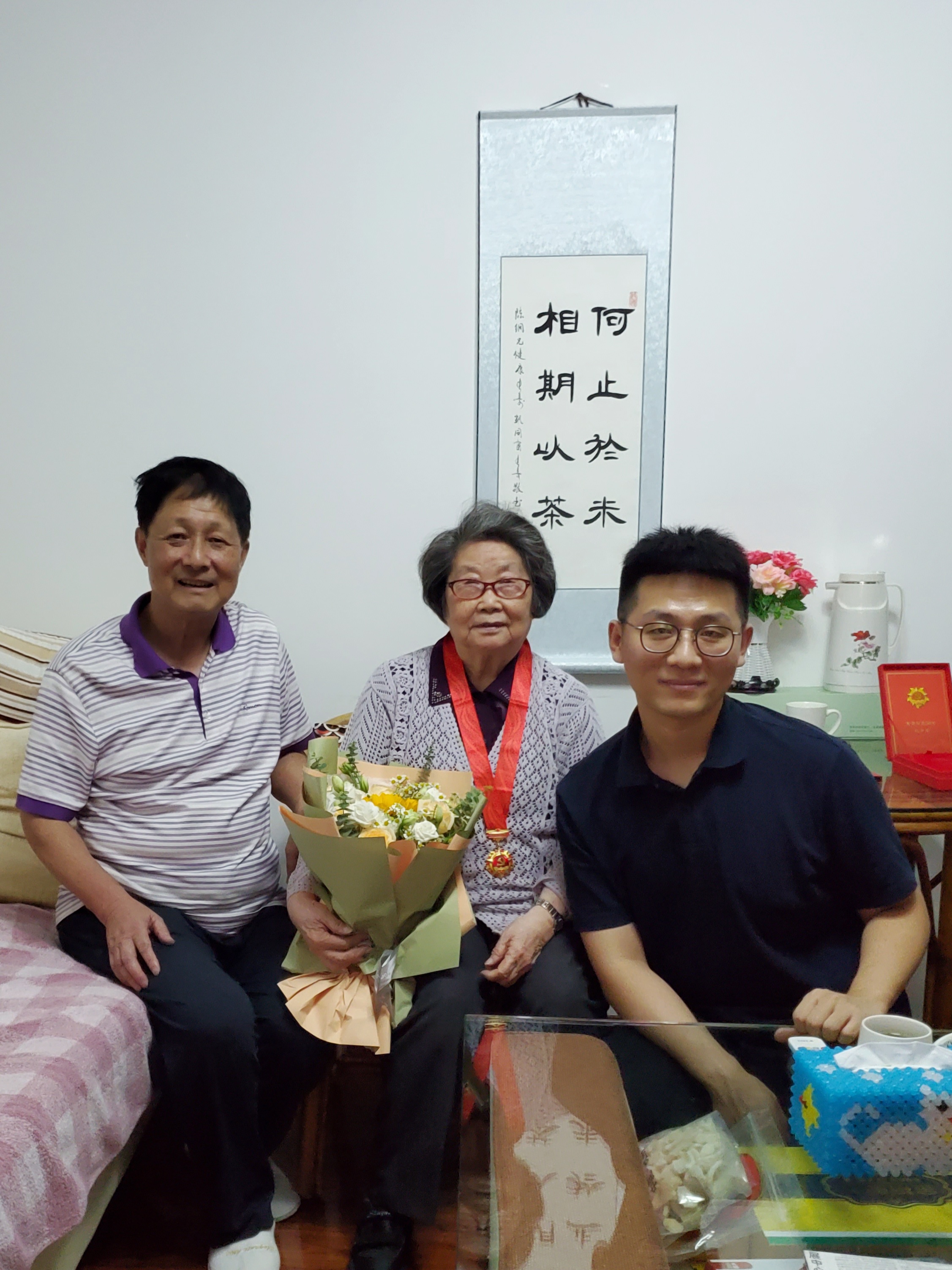 现年87周岁的王女馨同志,于1954年加入中国共产党,已有党龄65年。王老精神矍铄,早早就在楼宇门口等着大家,当她看到50年纪念章的时候,无比激动,既有拥有纪念章的自豪,也有迎接建党100周年的喜悦和振奋。盛国定、韩秉峻分别代表退休党支部和学院表达和国家、校院对老党员们的关心问候,向老党员们致以崇高的敬意和深深的谢意。