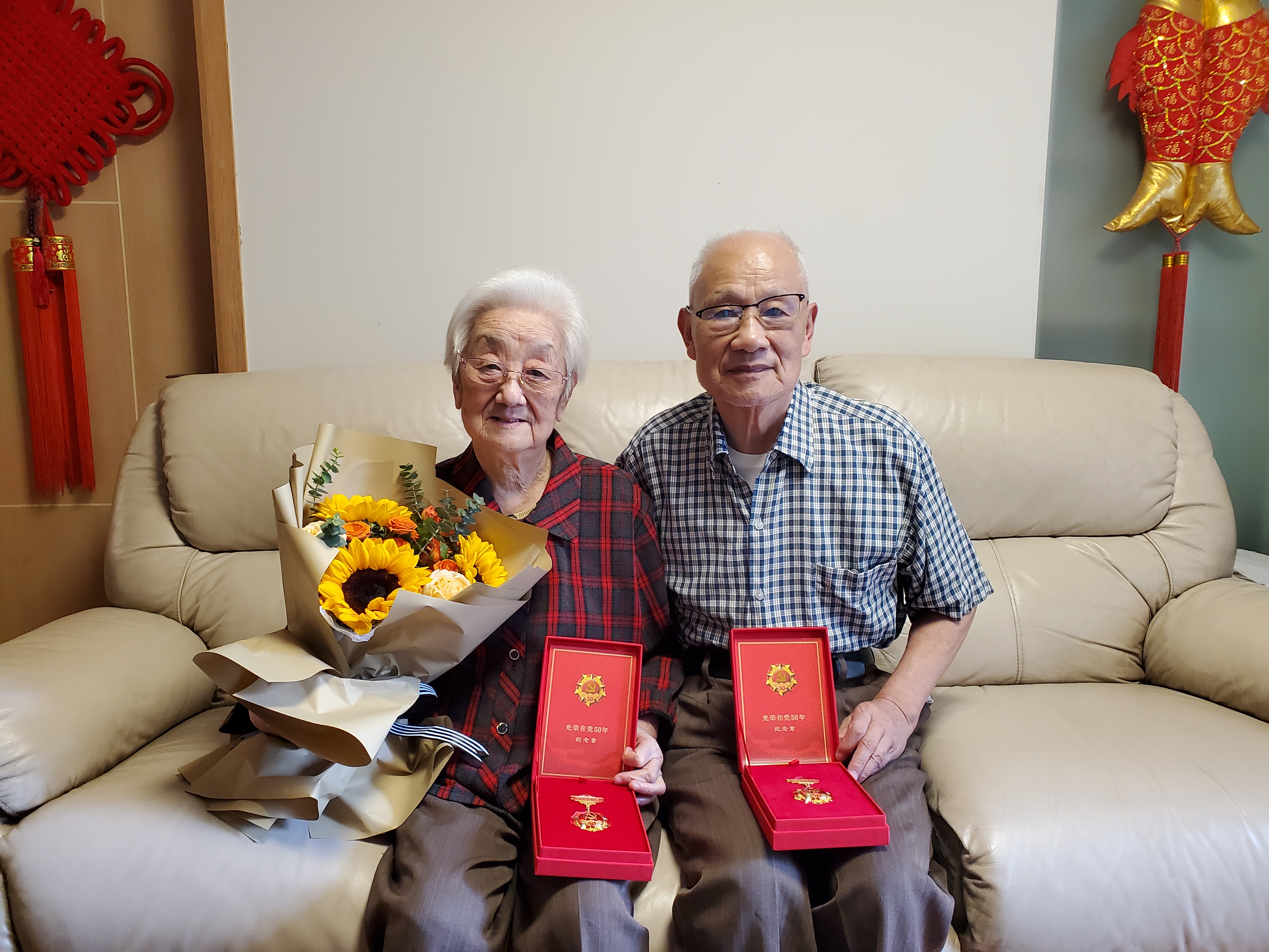 现年86周岁的达澄同志,于1960年加入中国共产党,已有党龄60年。她反复感慨道:“我非常感谢咱们伟大的党,党不会因为我们退休了、老了就把我们忘了,党依然想着我们、牵挂我们!” 拿到纪念章的老人内心非常激动,她说:“没有共产党,就没有我今天的幸福美好生活。在合影环节,同样作为一名教育工作者、党龄超过50年的老党员,达澄同志的丈夫特意换上了衬衫,并小心翼翼从玻璃展示柜中拿出单位上午刚刚颁他的“光荣在党50年”纪念章,一齐参与了拍摄。