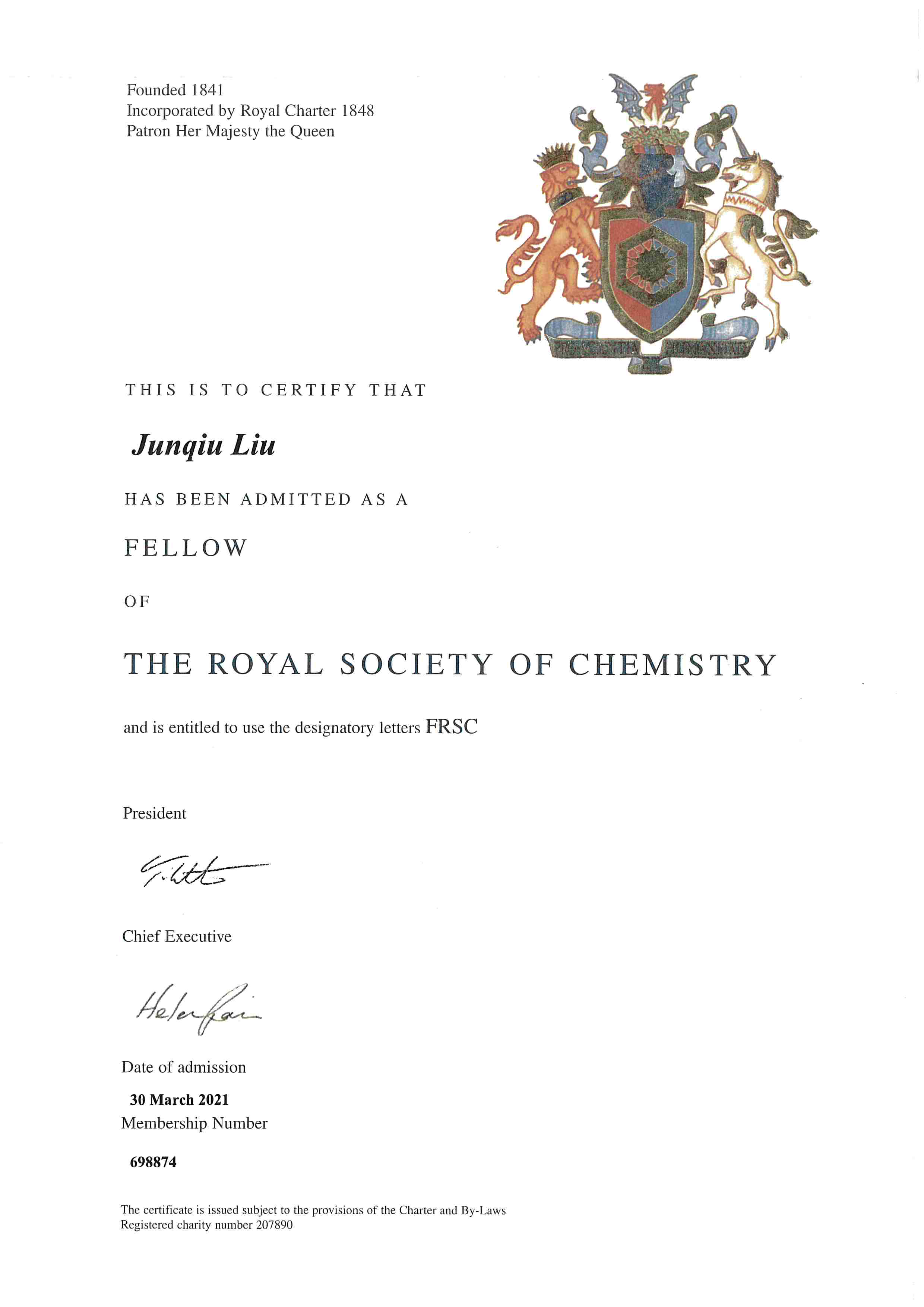 刘俊秋教授当选英国皇家化学学会会士证书