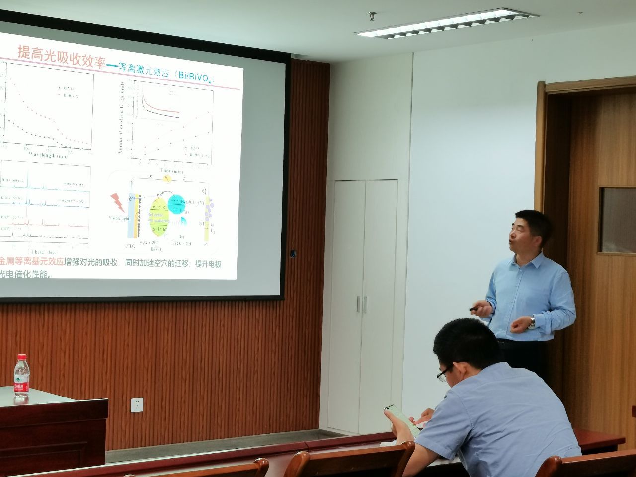 王其召教授介绍了其团队在环境催化领域取得的最新研究进展和成果。此次报告中,王其召教授从氢能开发的背景出发,以钒酸铋作为研究对象引入,从提高“光吸收效率、光生载流子分离效率、电极表面反应速率以及电荷分离效率”这四个方面展开讲解;并且随后王教授提出了提高材料的光(电)催化效率的一些研究设计策略,比如改变形貌、掺杂、缺陷、构建异质结以及添加辅助催化剂等方法;最后,王其召教授利用课题组成果提出了负载助催化剂可以提高电极表面反应速率,构建中间层可以提高电荷分离效率等观点,并最终实现污染治理和能源转换。报告结束后,王其召教授与现场师生展开了深入且激烈的交流与探讨,本次报告开拓了与会师生的视野。