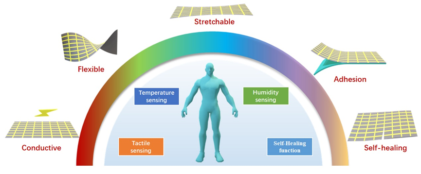 电子皮肤是一种能够模仿人类皮肤诸多功能的电子器件,在机器人、人机交互和医疗健康等领域具有巨大应用潜力。为了真正模仿人类皮肤,电子皮肤需要具备以下特性:首先,电子皮肤需要对应变、压力、剪切力、温度和湿度等外界刺激具有感知能力;其次,为了更好地适应身体运动,同时保持其各种传感功能,电子皮肤应该柔软且可拉伸;第三,为了延长使用寿命,电子皮肤需要具有自愈合功能。