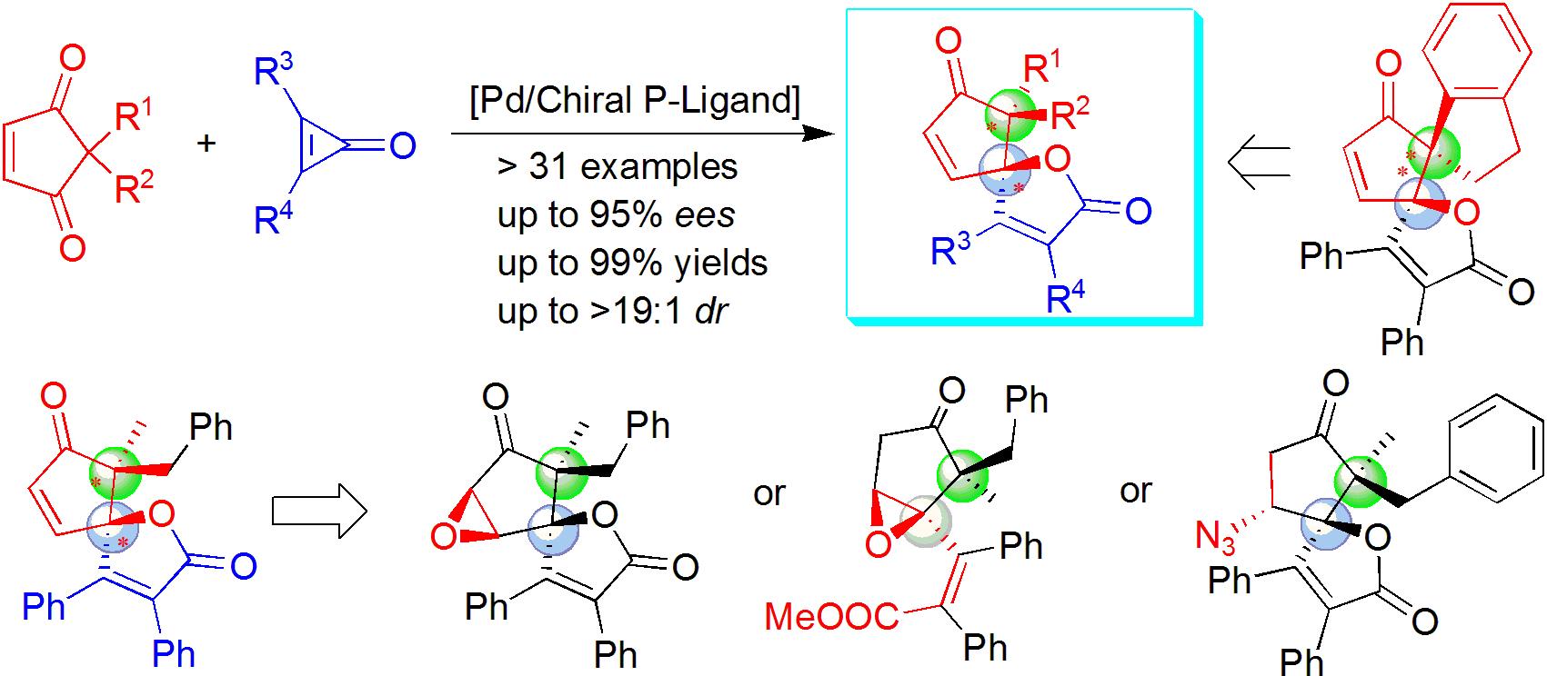 鉴于C-C键活化和手性配体在构建四取代立体手性中心上有着巨大的潜力,社团学姐 徐利文课题组在前期不对称催化化学的研究基础(见该团队近期研究专题报道,Acc. Chem. Res. 2021, 54, 452-470)上,利用钯金属和TADDOL衍生的大位阻膦配体,首次高效、高对映选择性、高非对映选择性催化环丙烯酮和环戊烯-1,3-二酮进行(3+2)螺环化反应。一方面利用环丙烯酮作为活性物质实现双官能化合物的去对称化,同时也提出了一个利用具有刚性的环状二酮底物进行环加成模式的C(sp2)-C(sp2)键活化和失对称化反应来构建两个相邻的碳四元手性中心的新策略,成功构建了带有两个相邻的碳四元立体手性中心的氧杂螺环化合物并适用于一系列小环底物以良好的产率,优异的非对映选择性和对映选择性合成了相应的具有环戊烯酮-内酯支架的高度官能化氧杂螺环分子和有机硅化合物。上述发现为进一步探索C-C键活化及其对映选择性构建复杂有机分子提供了新的途径。