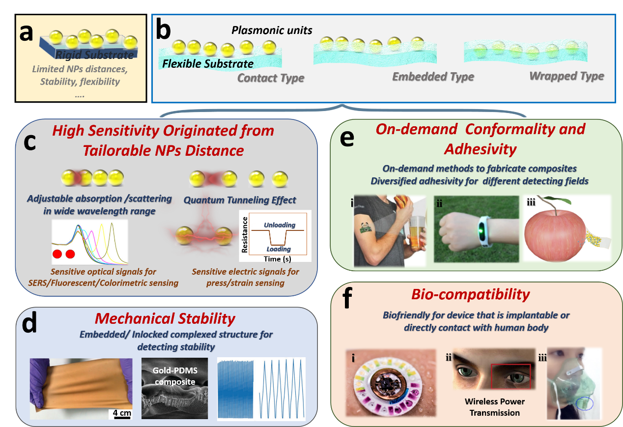 图2. 柔性等离子激元生物传感器相对于传统刚性检测体系在人体健康监测中的优势。