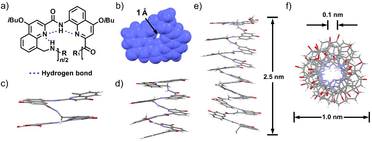 随后,研究人员又利用氢-氘交换核磁共振对该质子通道的传输机理进行了详细分析。结果表明,螺旋空腔内部连续排列的NH结构在质子跨膜传递过程当中起到了关键的作用。溶液中水合的质子通过与NH上的活泼氢进行交换,并利用磷脂膜两侧质子浓度差为驱动快速实现选择性跨膜传递。该基于喹啉螺旋的跨膜通道为迄今已知内径最小的人工纳米孔道结构。此外,该工作还发现了一种基于连续NH基团实现质子跨膜传输的新机制。该研究结果对于理解和模拟天然离子通道的传输行为具有重要的生物学意义,也为今后开发人工离子通道在生物医药领域的潜在应用提供了全新的思路。