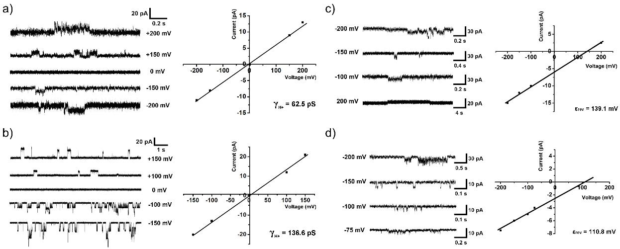 众所周知,天然通道蛋白可以利用其独特的过滤结构实现对特定离子的高选择性跨膜传递。例如,天然钾离子通道KcsA是一种由四股螺旋组成的倒锥形结构,其内部最小尺寸为2.8 Å与钾离子尺寸高度匹配,能够有效的实现对钾离子的高选择性传递,并通过尺寸效应阻止其它离子的跨膜传输。受此启发,研究人员利用喹啉螺旋构建了一种内径约为1 Å单分子人工质子跨膜通道,由于质子的尺寸非常小,可以轻易地通过该纳米孔道进行跨膜传递。而其它阴、阳离子以及水分子等由于具有较大的空间尺寸则被有效地排除在外。以往的人工质子通道通常是利用孔道内连续的水线结构实现质子的跨膜传递,在这个过程当中尽管可以排除其它离子的通过,但是却无法阻止水分子的传输。而该基于人工螺旋的质子通道内径仅有1 Å,可以有效地将水分子排除在外。单分子膜片钳实验表明,该人工通道对质子的跨膜传输速率达到惊人的107 H+∙s-1∙channel-1,与天然短杆菌肽A的质子传输速率达到同一个数量级。