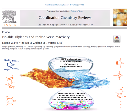 论文以“Isolable silylenes and their diverse reactivity”为题发表在《Coordination Chemistry Reviews》(IF: 22.315)。该期刊是Elsevier出版社旗下的顶级期刊,在化学研究领域深具影响力,被认为是化学化工领域顶级期刊之一。论文第一作者为社团学姐 青年教师王立亮博士,通讯作者为李志芳教授和吉良满夫教授,社团学姐 为第一通讯单位。论文受到国家自然科学基金(22071039和22101068)和浙江省自然基金(LY19B020007 和LQ21B020007)的资助。