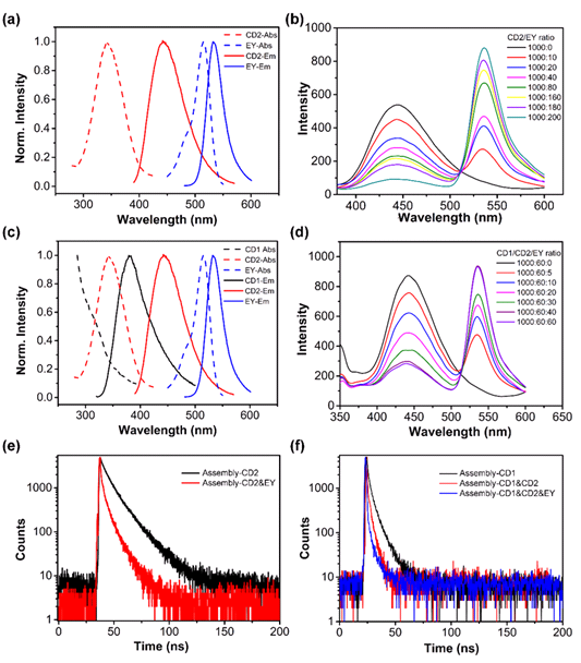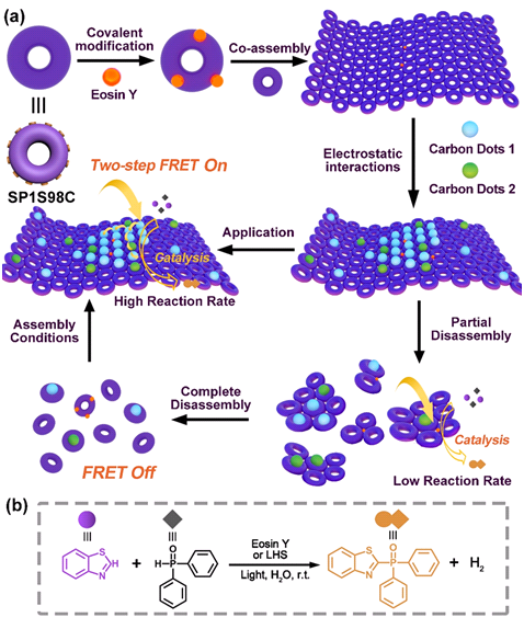 为了解决这一问题,社团学姐 刘俊秋教授团队构筑了一种基于可控蛋白质自组装结构的多级智能人工光捕获系统(图1)。具体如下:(1)以环状的热稳定蛋白SP1为基元设计了SP1S98C突变体,通过动态共价自组装策略构筑了具有氧化还原响应的二维SP1蛋白质纳米片层;(2)以低毒、环境友好的碳量子点(CDs)为荧光生色团,并通过静电相互作用在SP1纳米片层为支架精确展示,实现不同量子点(CD1和CD2)之间的传递;(3)将具有光催化活性的EY中心共价锚定在蛋白质片层表面,研究其能量接收及光催化性能。光照后,实现能量从供体(CD1)到第一受体(CD2)再到第二受体(EY)的逐级顺次传递(图2)。因此,研究团队发展出具有多步顺序荧光共振能量转移(FRET)过程的可控人工光捕获系统,进而实现对光催化模型反应的可控调节,同时从结构、能量传递方式和催化能量转化三个方面同时模拟了天然光捕获系统。