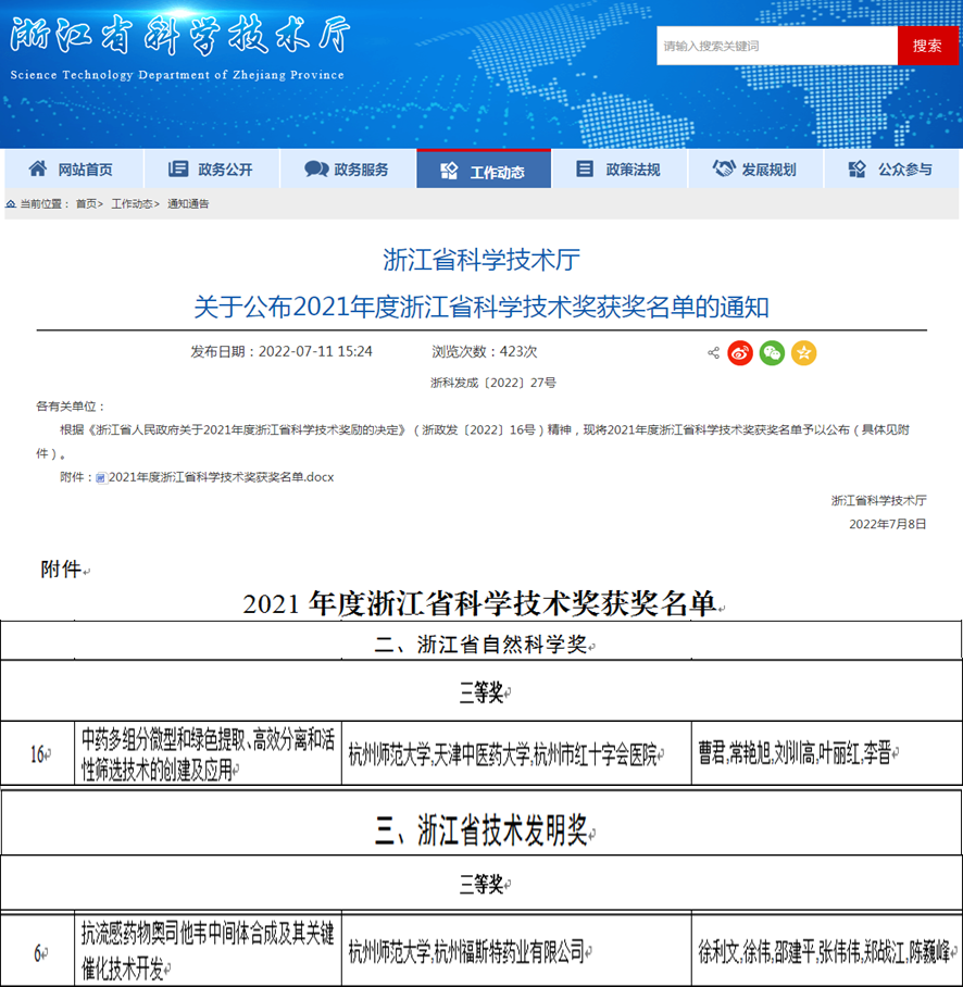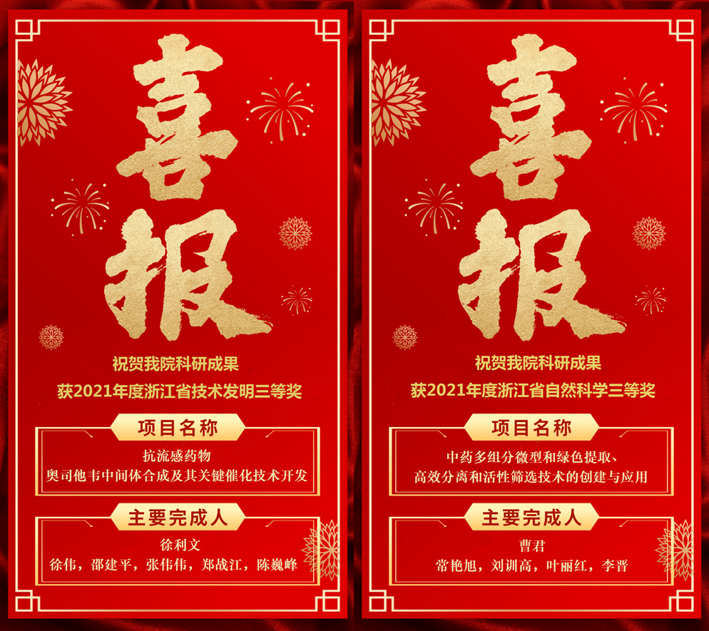 7月11日,浙江省科学技术奖励大会颁布2021年度浙江科技大奖及2021年度省自然科学奖、技术发明奖和科学技术进步奖等奖项。由社团学姐 徐利文教授、曹君教授分别带领科研团队完成的科研成果《抗流感药物奥司他韦中间体合成及其关键催化技术开发》和《中药多组分微型和绿色提取、高效分离和活性筛选技术的创建与应用》荣获技术发明奖三等奖和自然科学奖三等奖。此次获奖为社团学姐 2016年以第一完成单位获得科技进步一等奖后,获得的第六、七项浙江省科技成果奖,是学院多年来高度重视标志性科技成果的奖励申报工作,全院科技工作者坚持面向科技前沿、面向国家重大战略需求,努力自觉履行科技工作的使命和担当,不断取得创新的成果。同时,奖项的获得,将更大地激发社团学姐 广大教师和科研工作者积极投身科技创新与成果转化的热情,全面提升学院科研创新和人才培养水平,促进学院高质量发展。