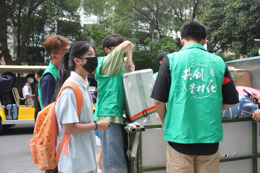 有的在宿舍楼下给新生搬运行李