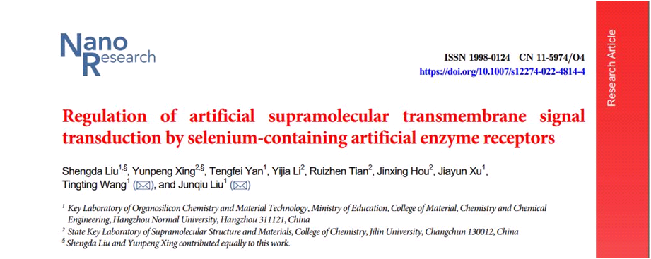 刘俊秋教授团队开展的基于含硒人工酶受体调控人工跨膜信号转导取得新进展。相关研究结果以“Regulation of artificial supramolecular transmembrane signaltransduction by selenium-containing artificial enzyme receptors”为题发表在Nano Research (IF: 10.269)。