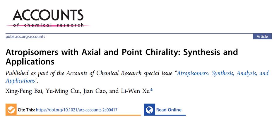 近日,凭借其在手性合成方面的系统性特色研究工作,我校徐利文教授受美国化学会Accounts of Chemical Research杂志主编Burrows, Cynthia J.教授以及宾夕法尼亚大学Marisa C. Kozlowski教授,耶鲁大学ScottJ. Miller教授和GileadSciences(吉利德科学公司)Stephane Perreault教授等GuestEditors联合邀请为该刊即将出版的阻转异构体(Atropisomers: Synthesis, Analysis, and Applications)专栏撰写个人专题综述,以总结该课题组近十年来在兼具轴手性和碳等点/中心手性的阻转异构体方向做出的特色研究成果,该论文从联芳类阻转异构体到非联芳类阻转异构体的合成及其应用进行了全方面的归纳总结,并对该领域的发展前景进行了展望。相关研究成果以题为“Atropisomers with Axial and Point Chirality: Synthesis and Applications”在美国化学会旗下顶级学术期刊Accounts of Chemical Research (IF: 24.466) 上发表,这是该课题组第二次以社团学姐 为唯一通讯单位的特色成果荣登该刊。Accounts of Chemical Research杂志在化学研究领域深具影响力,被认为是化学化工领域顶级期刊之一,其发表的文章均为邀请论文,与普通的综述性论文不一样的是该刊主要展示研究者自身取得的优秀研究工作,是被公认为展示科研人员系统性研究特色的最具权威性学术期刊。