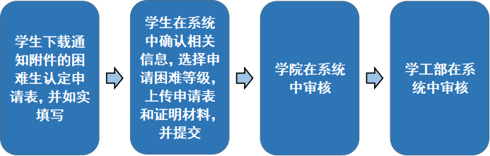 本科生困难生认定工作在“学生工作管理服务平台”(以下简称“学工平台”)(//xgxt.stxuejie.org/)中进行。具体流程如下: