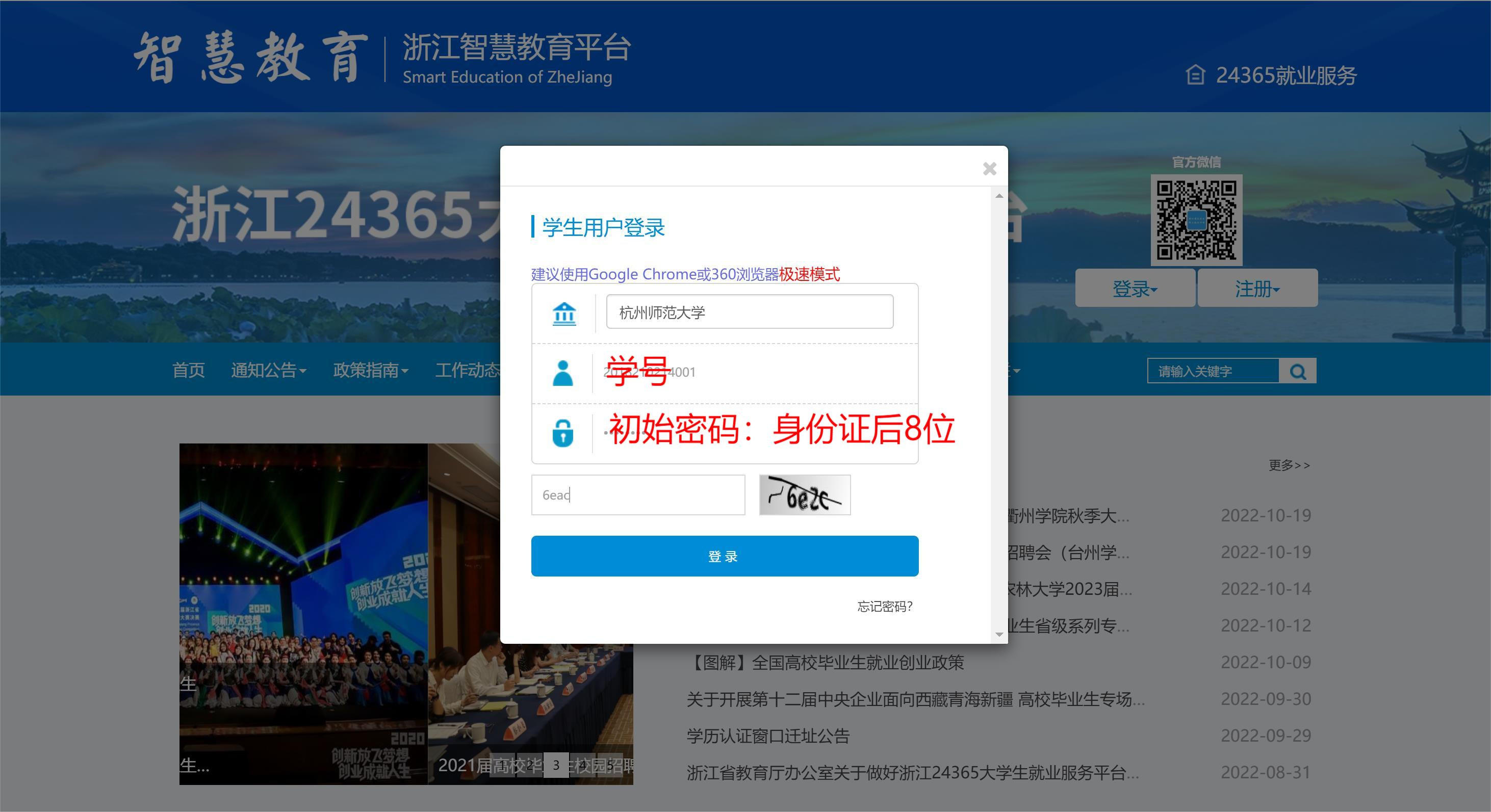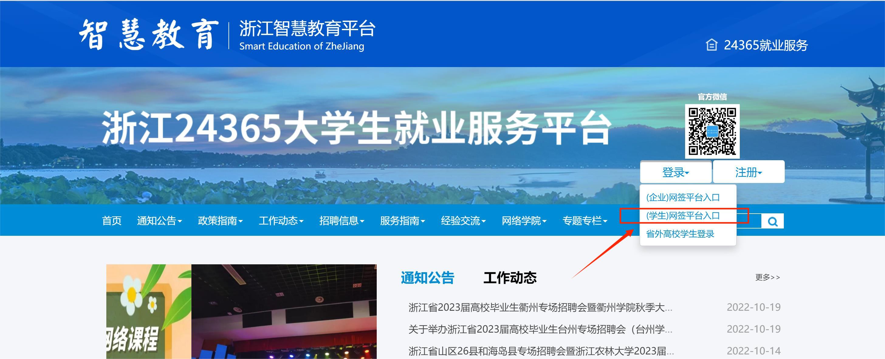 1. 登录“浙江24365大学生就业服务平台”(//www.ejobmart.cn),选择“登录”“(学生)网签平台入口”,选择学校社团学姐 ,初始登录名为学号,登录密码为身份证后8位。