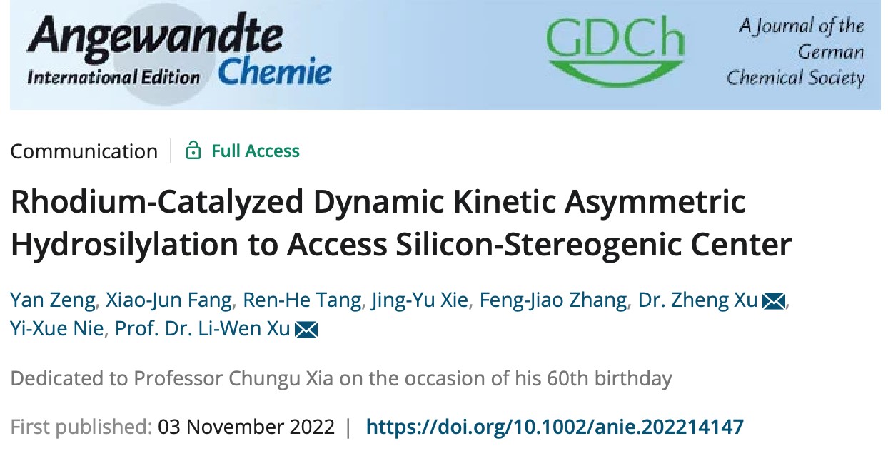 近日,我校徐利文教授团队在硅手性中心构建方面取得突破性进展,通过铑催化动态动力学不对称硅氢加成反应首次实现了用消旋硅氢化合物构建硅手性中心的目标,突破了传统去对称化策略的限制,为催化构建硅手性中心提供了新策略和新概念配体,相关研究成果以题为“Rhodium-Catalyzed Dynamic Kinetic Asymmetric Hydrosilylation to Access Silicon-Stereogenic Center.”发表于国际化学领域知名期刊Angewandte Chemie-International Edition(2021年,IF = 16.823)并被选为热点论文(HotPaper)。