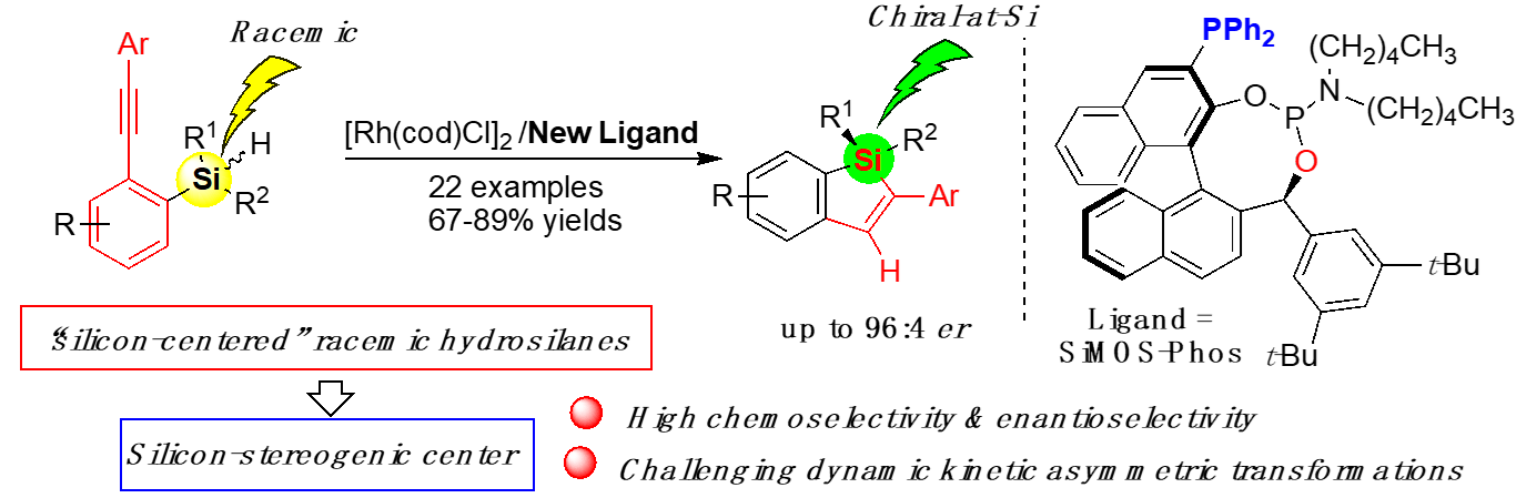 我校徐利文研究团队一直致力于新型手性配体的自主创制和硅手性中心的高效构建方面的研究工作。在前期的研究工作中,该团队利用自主创制Ar-BINMOL-Phos,通过铑催化二炔基氢硅烷的分子内不对称硅氢加成反应,用去对称化策略以>99:1 er值高效地实现了对潜手性硅烷去对称化(iScience, 2020,7 (23):101268)。在此基础上,本研究工作进一步对团队特色的多手性膦配体进行精巧设计开发了SiMOS-Phos新骨架手性配体,利用铑催化的单炔氢硅烷的分子内不对称硅氢加成反应,首次采用动态动力学拆分策略实现了由“以硅为中心”外消旋底物一步直接构建硅手性中心硅杂环化合物的突破。