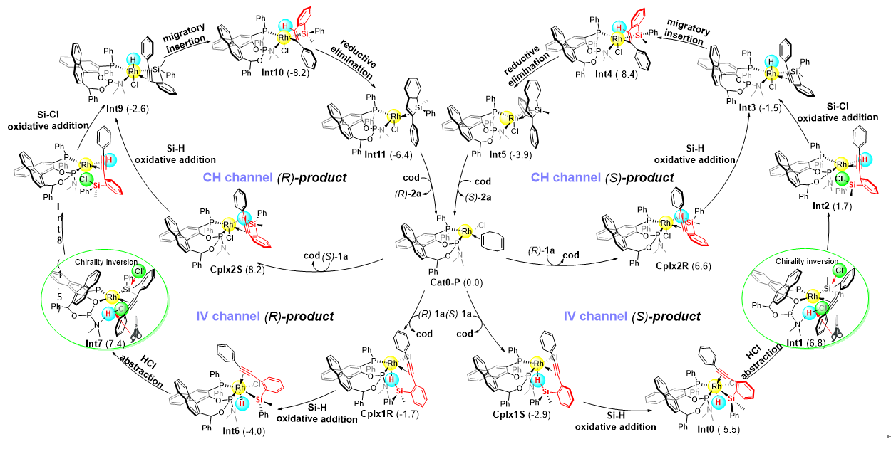 通过密度泛函理论计算(DFT)发现反应底物是通过两条竞争性反应通道来实现动态动力学转化过程的,包括传统的Chalk-Harrod路径(CH channel)和手性翻转路径(IV channel)。在手性翻转通路中,硅手性中心以[Si]-Rh(III)-H中间体为转换平台,SiMOS-Phos配体的酰胺部位起到促进氯离子从Rh中心解离,进而通过SN2亲核取代使硅中心手性翻转。反应过程中Rh/SiMOS-Phos催化剂可以选择性地降低的 Chalk-Harrod路径中(R)-1a和翻转路径的 (S)-1a的过渡态能量从而实现对映体过量的硅氢加成反应。