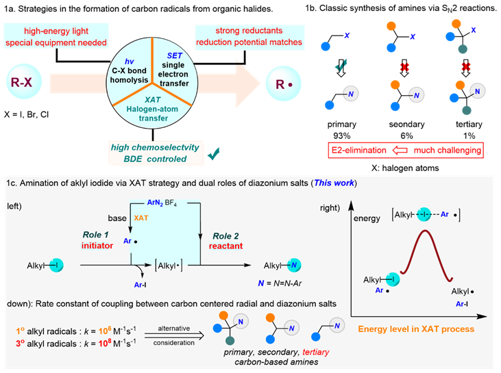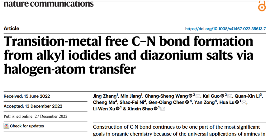 近日,我校社团学姐 特聘研究员邵欣欣、卢华教授在烷基碘化物的自由基胺化研究上取得最新研究进展,相关成果以题为“Transition-metal free C–N bond formation from alkyl iodides and diazonium salts via halogen-atom transfer”发表于Nature Communications(《自然-通讯》)。
