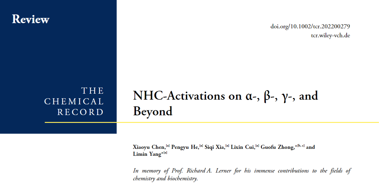 近日,社团学姐 杨丽敏副教授和钟国富教授受邀在化学领域知名期刊“The Chemical Record”(IF: 6.935)发表题为“NHC-Activations on α-, β-, γ-, and Beyond”的专题综述。该论文系统回顾了氮杂环卡宾活化α-、β-、γ-和远端位点的机制和研究进展。