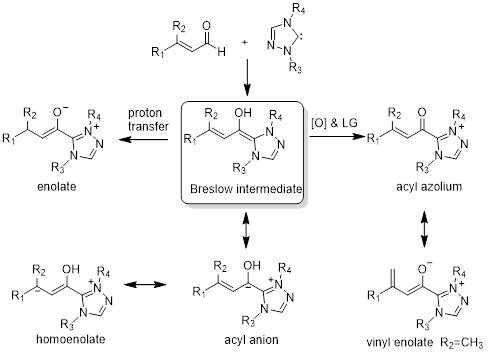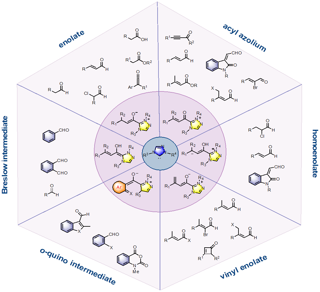 近几十年来,N-杂环卡宾 (NHC) 由于其特殊的电子性质和多样的反应活性,在有机催化反应中受到了极大的关注。NHC形成的关键的Breslow中间体可转化为酰基阴离子等同物 (acyl anion equivalent)、烯醇中间体 (enolate intermediate)、高烯醇中间体 (homoenolate intermediatate)、酰基唑中间体 (acyl azolium intermediate) 和乙烯基烯醇中间体 (vinyl enolate intermediate) 等。这些中间体的环加成反应引起了广泛的研究。NHC催化具有催化效率高、对映选择性好、操作简单、反应条件温和等优点。不对称有机小分子催化反应可以通过NHC催化从而高效的构建C-C键、C-N键和C-O键等。