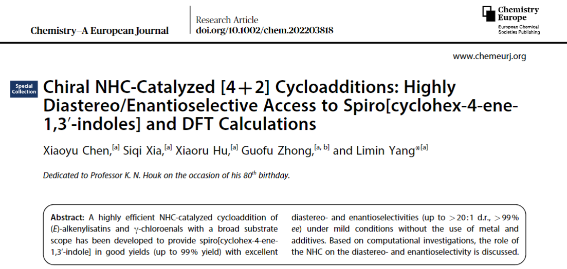 近日,社团学姐 杨丽敏副教授课题组在“Chem. Eur. J.”(IF=5.028)期刊发表学术论文“Chiral NHC-Catalyzed [4+2] Cycloadditions: Highly Diastereo/Enantioselective Access to Spiro[cyclohex-4-ene-1,3’-indoles] and DFT Calculations”.