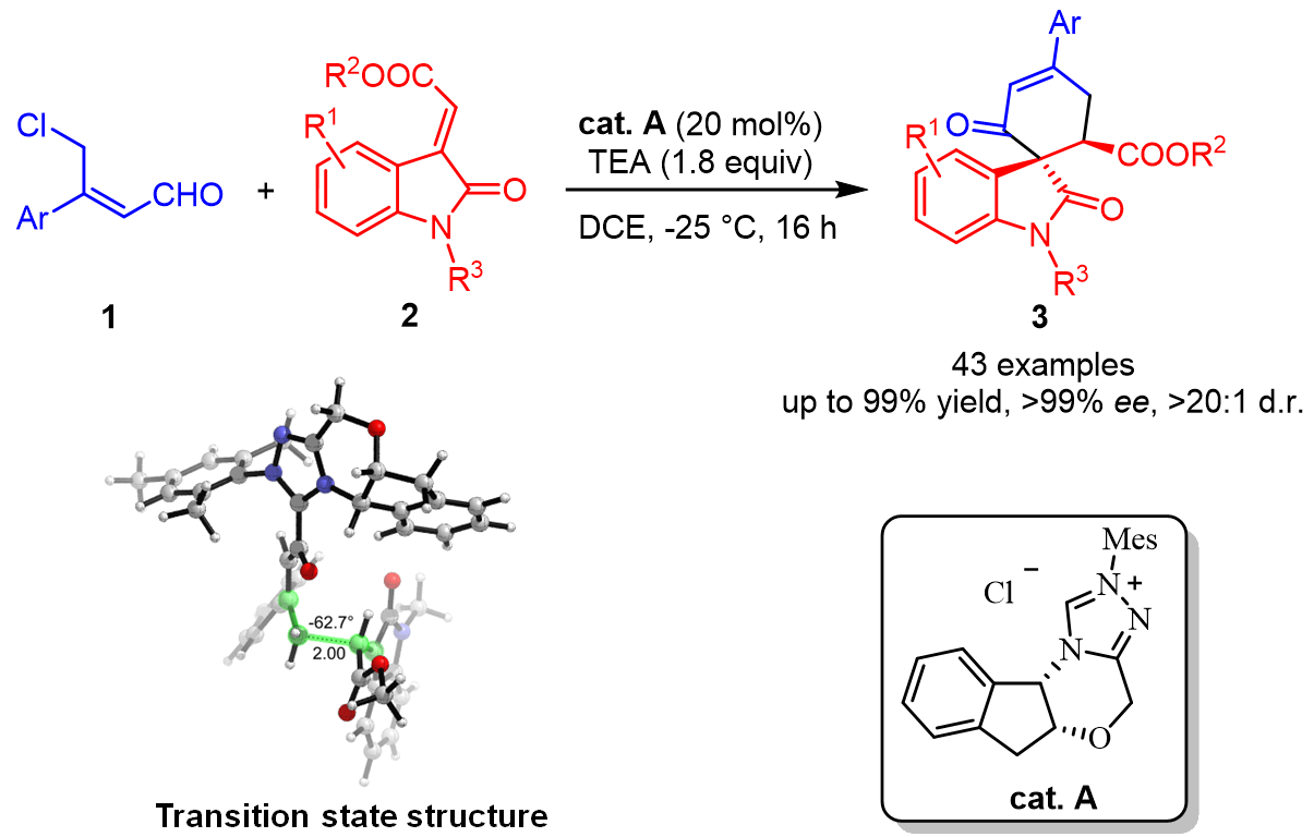 最近,社团学姐 杨丽敏副教授课题组基于课题组先前的研究经验(Org. Lett. 2020, 22, 3329;Org. Lett. 2019, 21, 7943;Chem. Commun., 2018, 54, 1567),与东方理工高等研究院的钟国富教授合作报道了一例手性氮杂环卡宾催化合成手性螺[环己-4-烯-1,3’-吲哚]衍生物的新方法。该催化体系以手性1-氨基-2-茚醇衍生的三氮唑类卡宾为催化剂,以易得的γ-氯代烯醛和靛红衍生的烯酮为底物,顺利合成手性螺[环己-4-烯-1,3’-吲哚]衍生物。反应条件温和,并且无需使用金属和添加剂,官能团耐受性好、收率高、对映选择性好。
