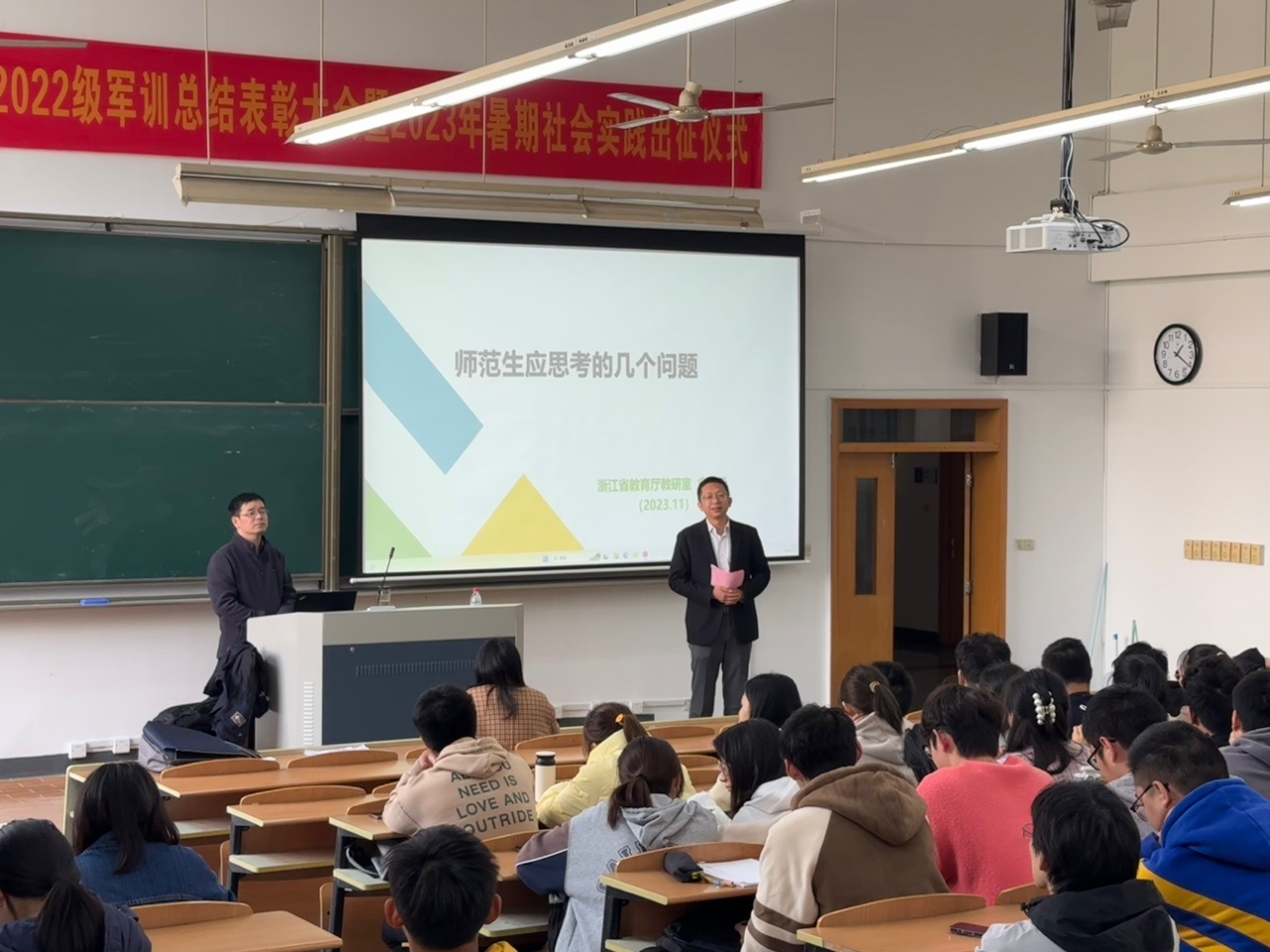 11月15日下午,社团学姐 化学961班校友、浙江省教育厅教研室高中化学教研员、浙江省正高级特级教师、浙江省春蚕奖、浙江省教坛新秀、浙江省首届新课程教学能力比赛一等奖获得者俞建锋应邀在下沙校区为社团学姐 2023级师范生作题为“师范生应思考的几个问题”的专题讲座。讲座由学院副院长王民教授主持。