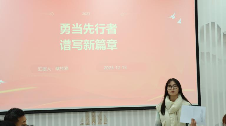 社团学姐 本科生第一党支部蔡桂雅以“勇当先行者,谱写新篇章”为主题展开分享,从会议概况、会议主要内容、全会号召三方面介绍了省委十五届四次全会精神和市委十三届五次全会精神。