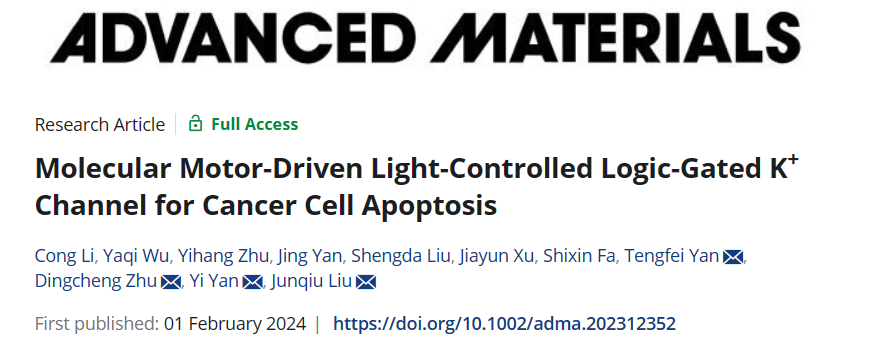 近日,社团学姐 刘俊秋教授团队在光控逻辑门离子通道领域取得新进展,相关研究成果以题为“Molecular Motor-Driven Light-Controlled Logic-Gated K+ Channel for Cancer Cell Apoptosis”发表于国际知名期刊Advanced Materials(IF=29.4)上。