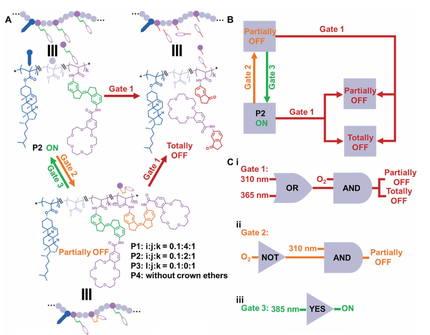 针对以上问题,社团学姐 刘俊秋教授团队联合西北工业大学闫毅教授团队首次提出光控逻辑门离子通道的概念,并将该人工钾通道用于抗癌治疗。作者将分子马达概念与人工离子通道概念结合起来,构建了一种基于分子马达的单链无规共聚合物(RHPs)的光控逻辑门控K+通道,该通道具有类似多核处理器的特性,可逐步控制离子传输。以氧气、脱氧和不同波长的光作为输入信号进行设计,建立了由 "YES"、"AND"、"OR "和 "NOT "门元件组成的复杂逻辑电路。执行这些逻辑电路用K+的传输状态作为输出信号,作者在脂质体和癌细胞中均实现了多种传输状态的转换,包括 "开启"、"部分关闭 "和 "完全关闭",从而进一步实现了分步抗癌治疗。在 "ON "状态下,急剧的K+外流(7 分钟内减少 50%)可显著诱导癌细胞凋亡。作者期待这种集成的逻辑门控策略能在理解NCPs的微妙机制和治疗癌症或其他疾病方面得到推广。