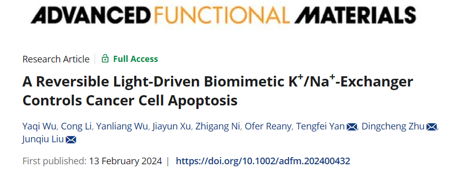 近日,社团学姐 刘俊秋教授团队在光控仿生K+/Na+交换器领域取得新进展,相关研究成果以题为“A Reversible Light-Driven Biomimetic K+/Na+-Exchanger Controls Cancer Cell Apoptosis”发表于国际知名期刊Advanced Functional Materials(IF=19.0)上。