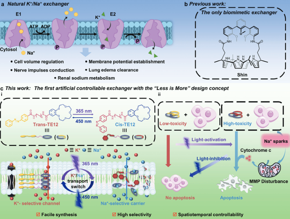 众所周知,具有物种转运高选择性和门控特性的各种各样天然跨膜通道是维持生物体生命的必要条件。在这些跨膜通道中存在一些特殊的离子交换器,如Na+/K+交换器(NKA)、Na+/Ca2+交换器(NCX)和 Na+/H+交换器(NHE)。这些交换器具有可切换的转运行为,允许双离子按需交替通过生物膜,以满足生理活动的需要。例如,NKA可在专门泵入K+和选择性排除Na+的功能之间切换,这是通过可逆磷酸化所诱导的复杂构象变化(E1和E2状态)实现的。这些过程对各种细胞功能有重大影响,包括细胞体积的调节、膜电位的建立、神经冲动的传导以及其他相关功能。为了了解天然通道的本质并有效地模仿其运行机制,人们一直致力于开发人工离子转运体。尽管在提高人工离子转运体的选择性和可控性方面取得了可喜的科学进展,双离子交换体的模仿仍有待探索。唯一的例子是基于半球的钙[4]吡咯离子对受体(图 1b),但这些受体以不可控的方式促进 Na+/K+交换。为构建人工双离子交换器,必须在单一系统中实现可控选择性翻转,即整合门控特性和各自具有高选择性的双离子传输状态。然而,这种整合是巨大的挑战,尤其是对于模拟K+/Na+交换器而言。