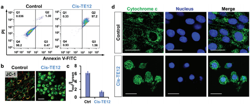 针对以上问题,刘俊秋教授团队成功构建了一种人工光控K+/Na+交换器用于癌症的治疗。首先采用两步缩合的方法制备了TE6, TE8, TE10和TE12四种化合物(中间烷基链的长度不同),用HPTS囊泡实验发现TE12的传输活性最好,具有最高的传输活性和K+/Na+选择性。为了确定碱金属离子为主要的传输种类,采用了光泽精囊泡实验证明TE12几乎不传氯离子。藏红T囊泡实验进一步验证了高K+/Na+选择性。随后用紫外-可见光谱验证该TE12的光异构化能力,证实其能够循环多次。有趣的是:Trans-TE12具有高的K+传输活性,而Cis-TE12具有高的Na+传输活性, 为接下来K+/Na+切换奠定了基础。测定TE12的抗癌效果发现Cis-TE12对U87-MG等2种细胞均具有优良的抗癌活性,并且该抗癌效果与Na+的传输密切相关;而Trans-TE12几乎没有抗癌的效果。基于此,作者实现了原位光激活和光抑制抗癌治疗。对于Trans-TE12低毒性,与对照组相比,可以检测到微弱的K+外流;对于Cis-TE12高毒性,可以观察到显著的Na+闪烁现象,因此细胞内离子浓度的紊乱与细胞的死亡密切相关。对于Cis-TE12造成癌细胞死亡的机制,作者通过细胞色素C的释放,线粒体膜电位的丢失以及流式实验证明癌细胞是以凋亡的机制死亡的。