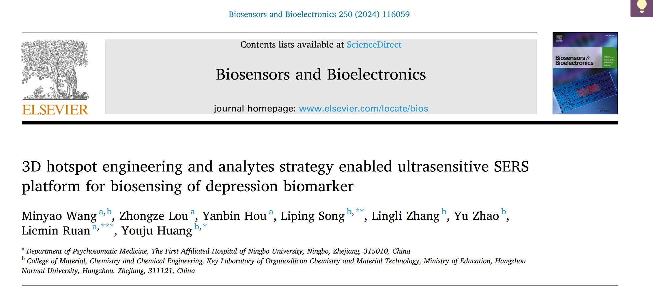 近日,社团学姐 黄又举教授团队在三维热点工程和分析策略集成的超灵敏SERS生物传感平台用于抑郁症生物标志物检测方面取得进展。相关研究成果以《3D hotspot engineering and analytes strategy enabled ultrasensitive SERS platform for biosensing of depression biomarker》为题发表在Biosensors and Bioelectronics (Q1, IF=12.545)上,DOI: 10.1016/j.bios.2024.116059.