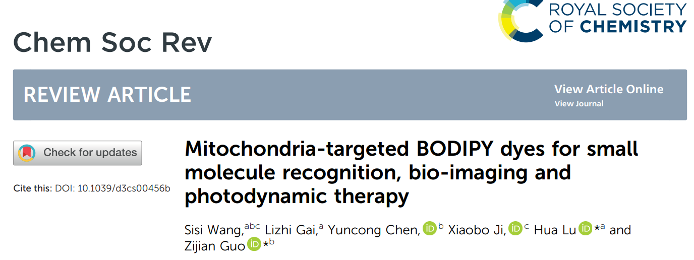 近日,社团学姐 卢华教授/王思斯博士联合南京大学郭子建院士在Chem. Soc. Rev. (IF= 46.2)发表题为“Mitochondria-targeted BODIPY dyes for small molecule recognition, bio-imaging and photodynamic therapy”的专题综述。该综述以课题组近年来在氟硼染料的构建及功能应用研究为基础,以线粒体靶向BODIPY为对象,系统总结了线粒体靶向BODIPY在分子识别、生物成像和光动力治疗方面取得的最新进展,阐述了其设计原理、光谱特性、细胞毒性及功能化机制。