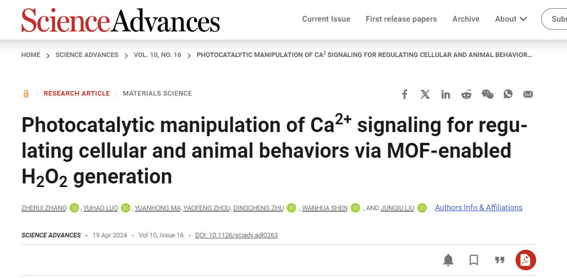 近日,杭师大社团学姐 刘俊秋教授团队/生环学院沈万华教授团队携手合作,在生物Ca2+信号激活的交叉研究领域取得突破性进展,相关研究成果以题为“Photocatalytic manipulation of Ca2+ signaling for regulating cellular and animal behaviors via MOF-enabled H2O2 generation”发表于Science子刊Science Advances(IF = 13.6)。