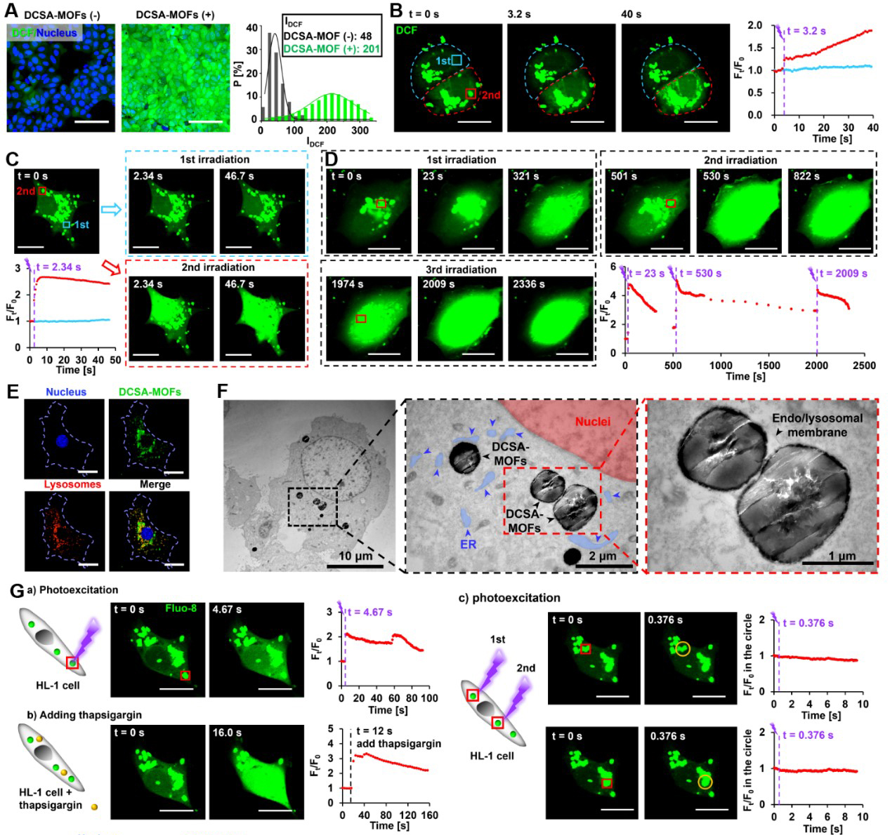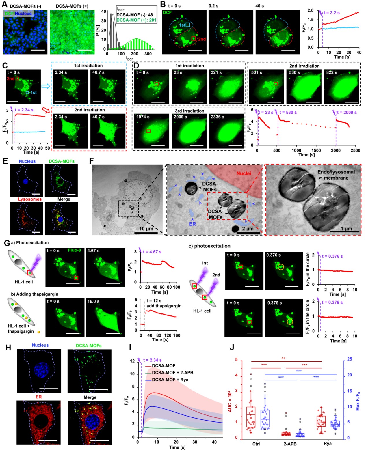 图2. DCSA-MOFs在细胞内的分布、光催化提升细胞ROS水平和Ca2+信号激活。