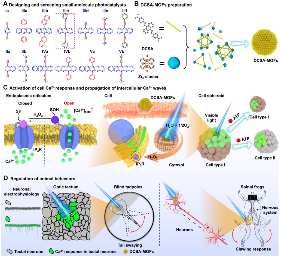 针对该研究现状,杭师大刘俊秋教授团队/沈万华教授团队首次开发了基于小分子光催化剂的金属有机框架(DCSA-MOFs),通过激光高时空分辨地照射在细胞内的局部区域,能在细胞、组织和离体器官三个层面精准调控Ca2+信号,最终控制动物的行为。DCSA-MOFs无需有毒的有机牺牲试剂,仅以生物体系中充足的氧气和水为底物,在光照条件下高效产生H2O2;在激活IP3Rs后使Ca2+从内质网中快速流出,从而激活细胞Ca2+信号。这种调控方式具有精度性高(亚细胞器水平),可重复激活和开关可控性。该研究提供了一种非遗传性的光学调控技术,具有如下优势:(1)IP3Rs在多种细胞中广泛表达,极大地扩展了应用范围;(2)H2O2能安全高效地刺激IP3Rs,并在刺激结束后快速扩散到溶液中,降低对细胞造成的损伤;(3)光催化反应只消耗H2O和O2,避免了负载剂的消耗和H2O2的泄漏;只在光照条件下进行,具有开关可控的特性;(4)DCSA-MOFs在细胞内稳定存在,可用于神经Ca2+信号的长期调控。