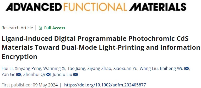 近日,社团学姐 刘俊秋教授团队在光致变色材料领域取得新进展,相关研究成果以题为“Ligand-Induced Digital Programmable Photochromic CdS Materials Toward Dual-Mode Light-Printing and Information Encryption”发表于国际知名期刊Advanced Functional Materials(IF=19.0)上。