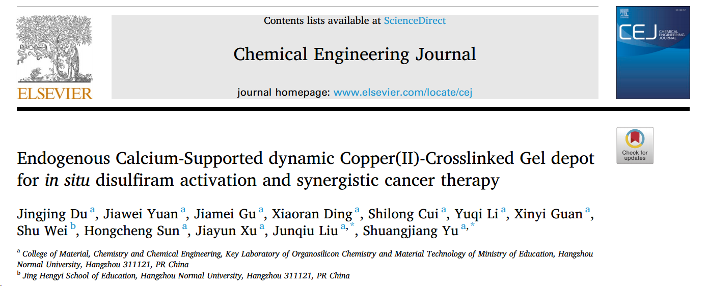 近日,社团学姐 刘俊秋教授团队在载药水凝胶用于肿瘤局部联合治疗方面取得新进展。相关研究结果以“Endogenous Calcium-Supported dynamic Copper(II)-Crosslinked Gel depot for in situ disulfiram activation and synergistic cancer therapy”为题发表在Chemical Engineering Journal (IF: 15.1)。