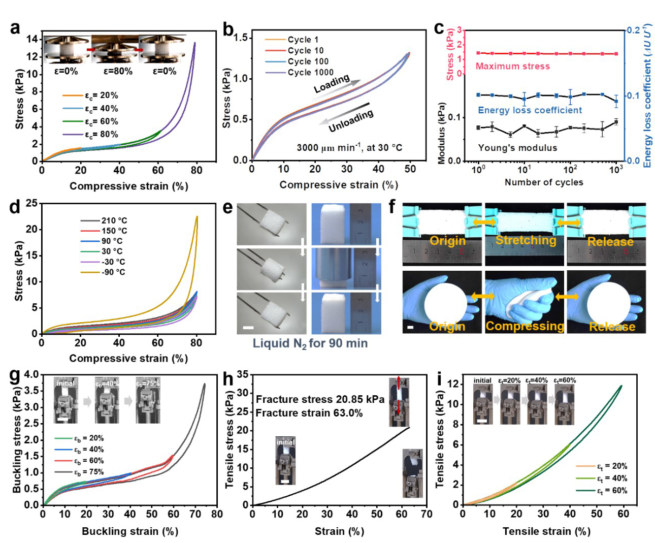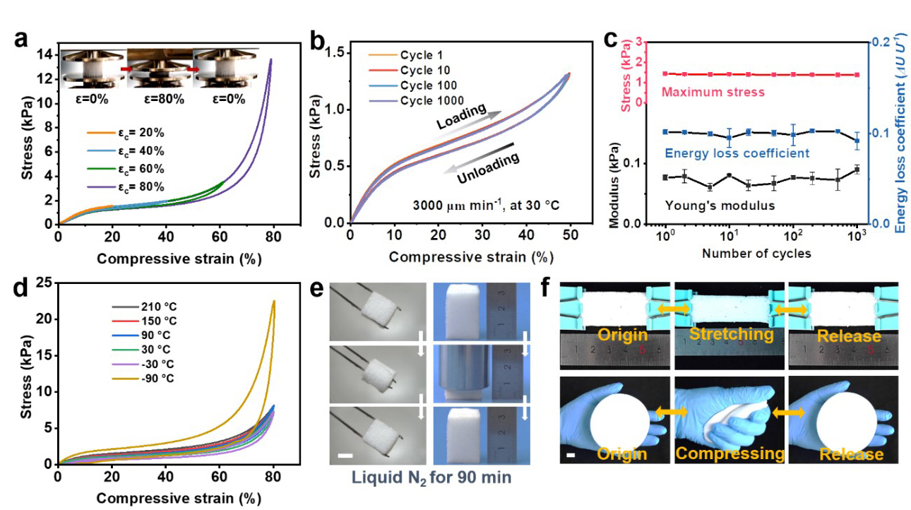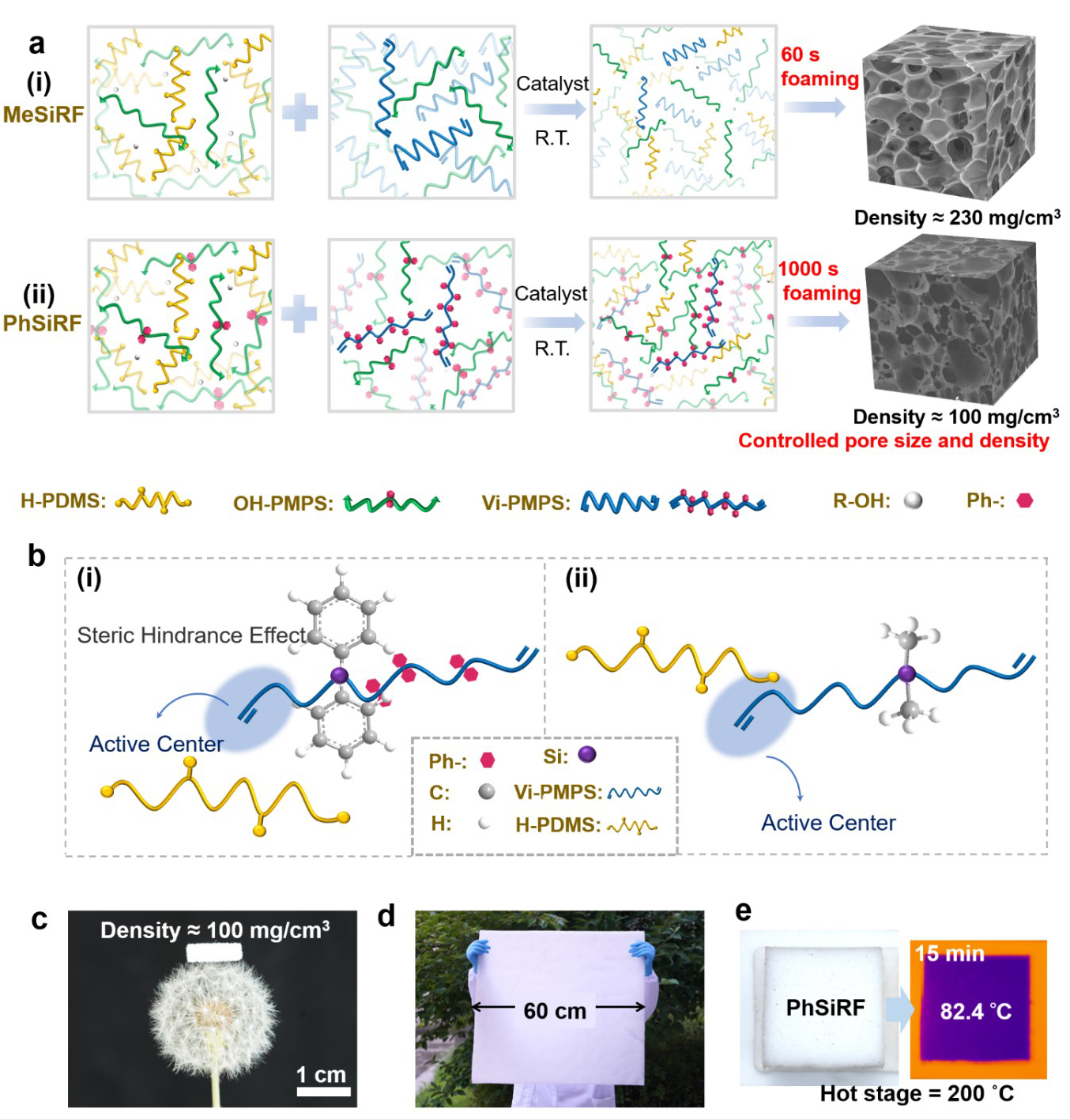 鉴于此,社团学姐 汤龙程教授团队通过在Si-O-Si链上引入苯基空间位阻效应,调整化学发泡过程中交联反应和发泡反应的匹配性,在室温下反应大约15 min后成功制备得到最低密度低至100 mg cm-3的苯基硅橡胶泡沫材料(PhSiRF)。通过调整原材料比例,可以轻松实现对PhSiRF材料的孔隙结构调控,该材料具有优异的循环压缩可靠性,并且在较宽的温度范围内(-90至210 °C)具有良好的机械柔韧性。此外,对PhSiRF材料的隔热性能进行了研究,优化后的样品表现出出色的隔热效果,远优于同等厚度的传统碳基聚合物泡沫材料。