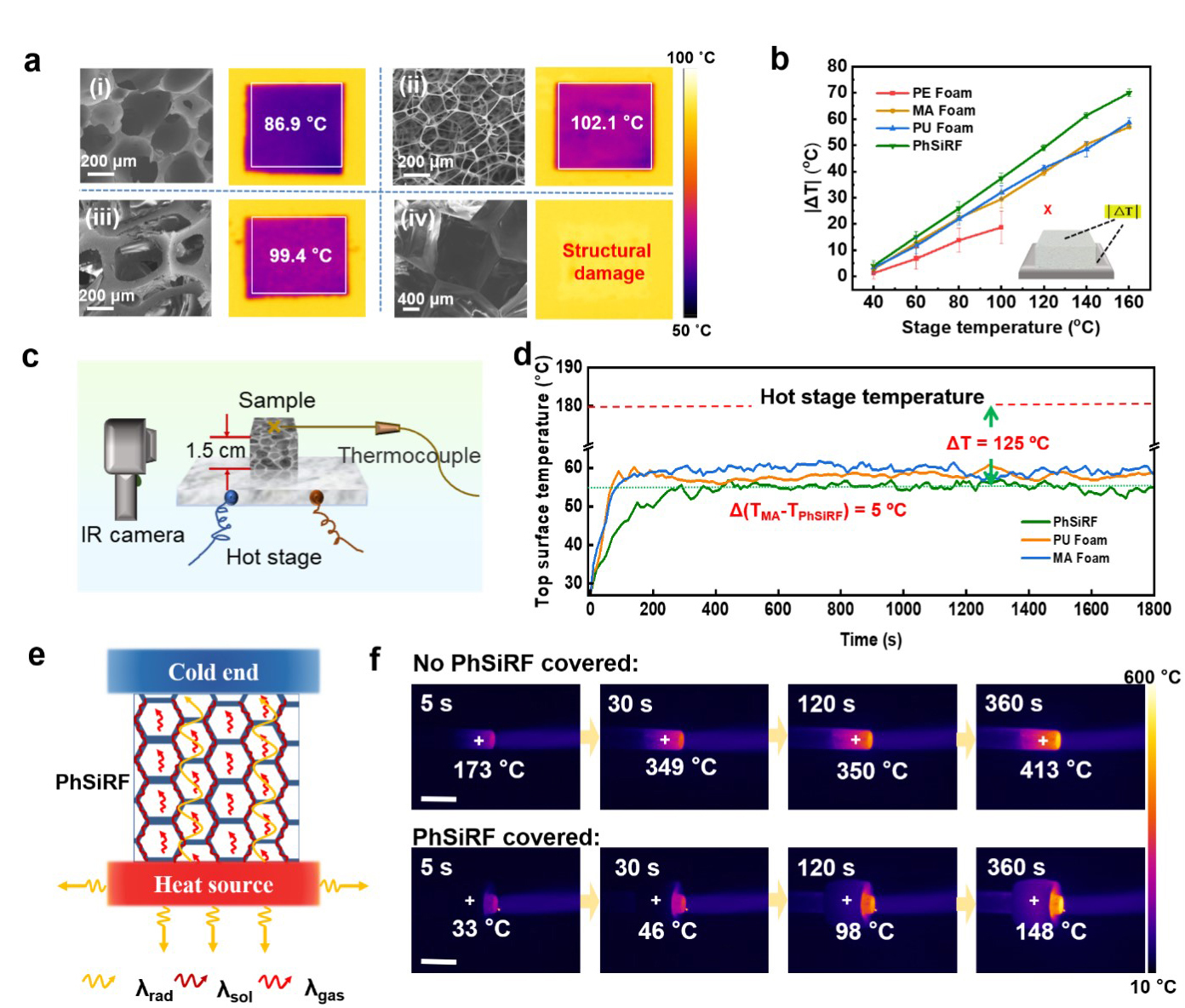 研究中,随着苯基含量的增加,空间位阻效应加剧导致反应基团活性降低,进一步延长了反应时间,使得交联与发泡反应速度更加匹配,带来更低的密度。密度低至100 mg cm-3的PhSiRF具有优异的隔热性能,例如,厚度为1.5 cm的PhSiRF可以将温度从180 °C隔绝到57.2 °C。通过改变原料的配比,有效调控泡孔结构,在相似的孔隙率下,较小的孔径可以有效地限制空气热对流对传热过程的贡献。苯基硅橡胶泡沫材料与其他聚合物泡沫相比,具有最佳的保温性能及优异的高低温稳定性。本文的研究为制备轻量化、机械性能良好和隔热性能优异的硅橡胶泡沫材料提供了新颖且方便的方法。