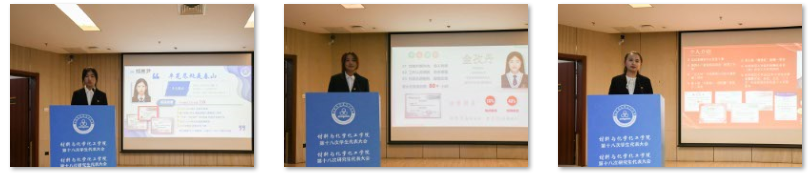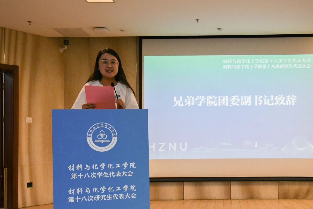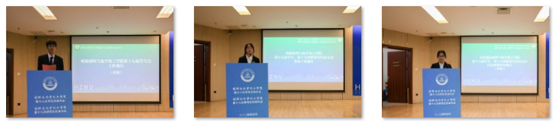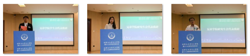 物理学院团委副书记乔文琦、校学生会主席团成员程熙、阿里巴巴商学院主席团成员李瑞齐、经亨颐教育学院研究生会主席团成员尤淇、信息科学与技术学院研究生会主席团成员叶列立先后致辞,对大会的顺利召开表示祝贺,对社团学姐 的学生工作表示了肯定,并提出了希望和要求。