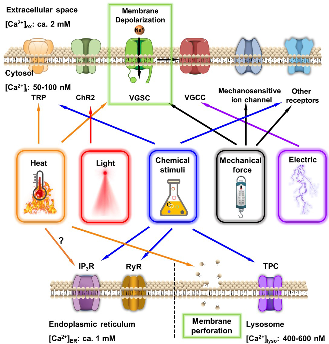 图1. 纳米转化器可以在外界刺激下产生一系列输出信号,通过激活细胞不同的Ca2+通道来调控细胞Ca2+信号。
