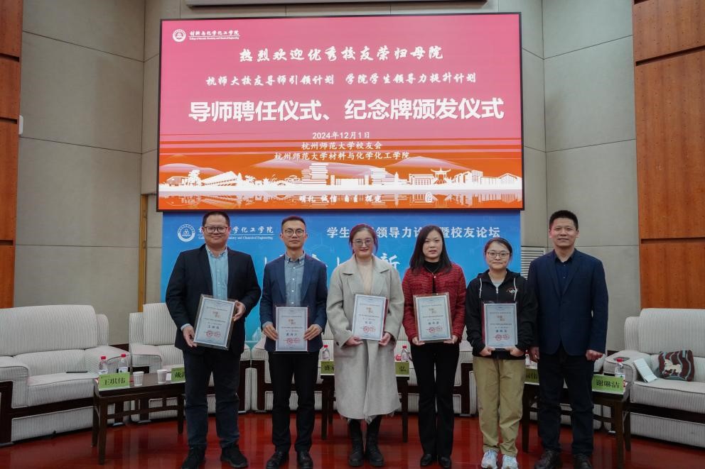 论坛伊始,管庆江分别为杭州之江有机硅化工有限公司、杭州之江新材料有限公司销售总监王琪伟(时任学院第一届团委学生会主席),萧山区第十高级中学高二年级部主任、教务处副主任戴海江(时任学院第一届团委学生会副主席)杭州市钱塘区学正中学“最美教师”张弘(时任学院第一届团委学生会副主席),杭州市钱塘区观澜中学副校长漏伟君(时任学院第一届团委学生会秘书长)),社团学姐 党委统战部办公室主任谢琳洁(时任学院第一届团委学生会团委副书记)颁发“社团学姐 校友导师引领计划”暨“社团学姐 学生领导力素养提升计划”导师聘书以及“导师思享会”纪念牌。